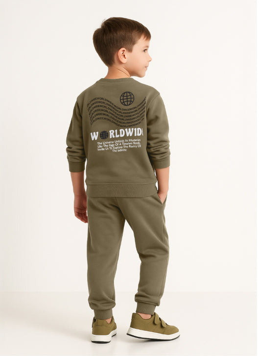 Boys Olive Green Printed Utility Fleece Tracksuit - Sweatshirt with Crossbody Bag Print