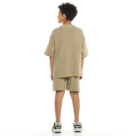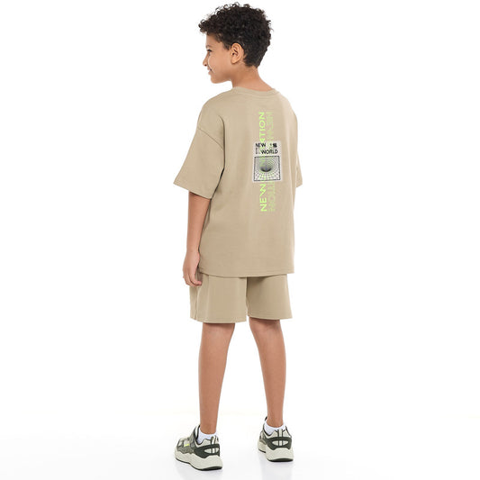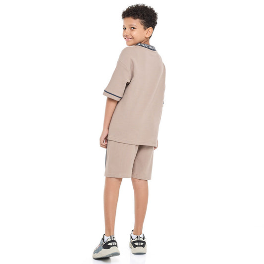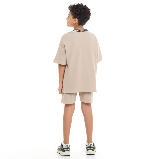 Victor and Jane Boys' Cord Set – Beige T-Shirt and Shorts Outfit with Label Detail