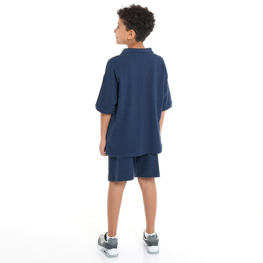 Victor and Jane Boys' Jacquard Set – Navy 2-Piece Outfit with Pockets, Polo T-Shirt and Shorts