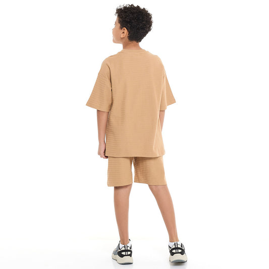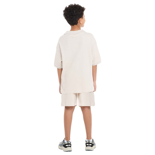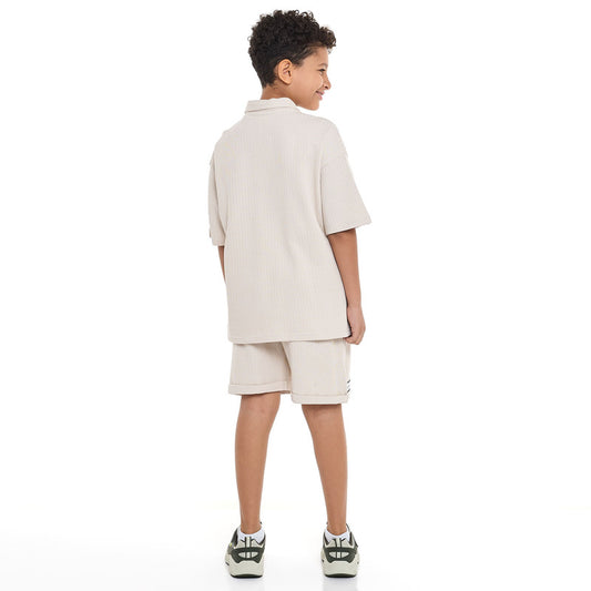 Victor and Jane Boys' Jacquard Set – Beige 2-Piece Outfit with Patch Polo T-shirt and Shorts