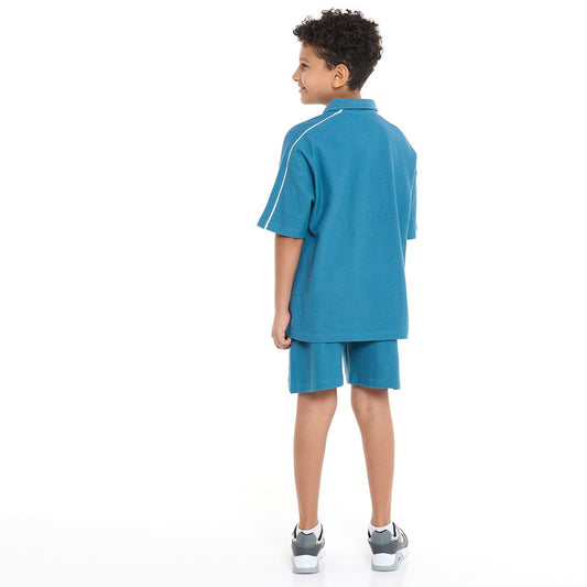 Victor and Jane Boys' Jacquard Set – Teal 2-Piece Outfit with Pockets, Polo T-Shirt With Half Zipper and Shorts