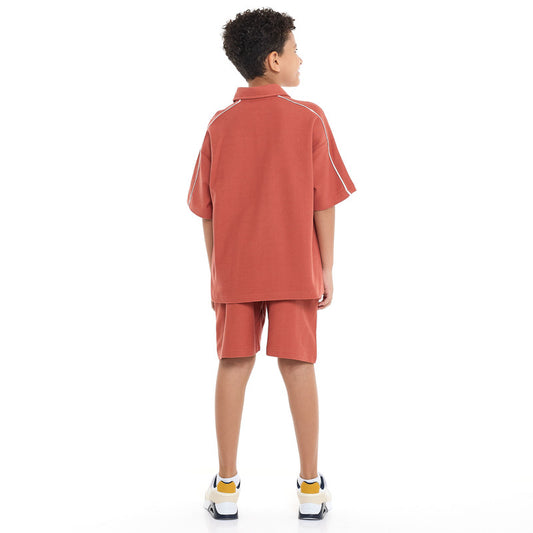 Victor and Jane Boys' Jacquard Set – Rust 2-Piece Outfit with Pockets, Polo T-Shirt With Half Zipper and Shorts