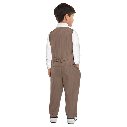 Stripe Beige Waistcoat And Pant Set With Shirt And Bow Tie