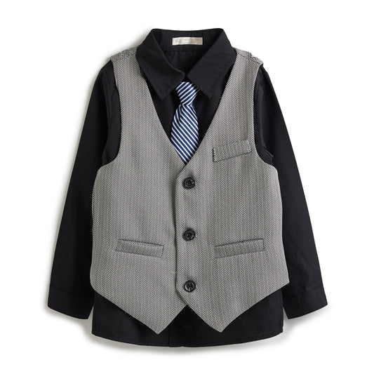 Grey Herringbone Waistcoat And Pant Set With Shirt And Tie