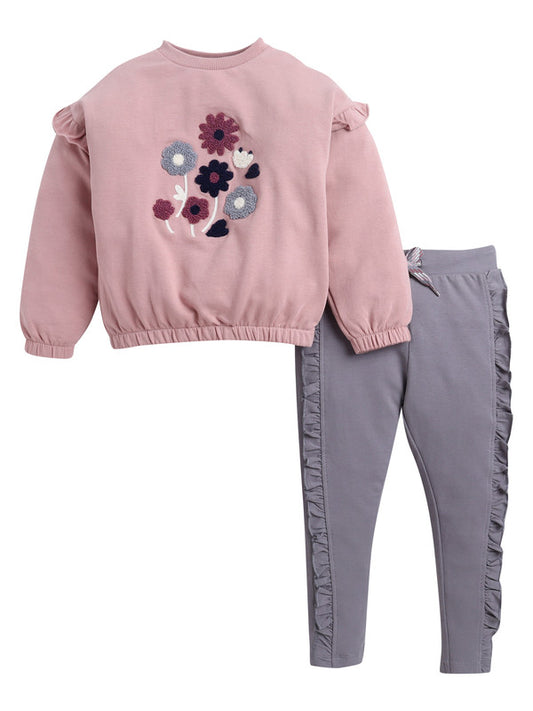 Girls Floral Chenille Fleece Tracksuit – Dusty Rose & Grey 2-Piece Set