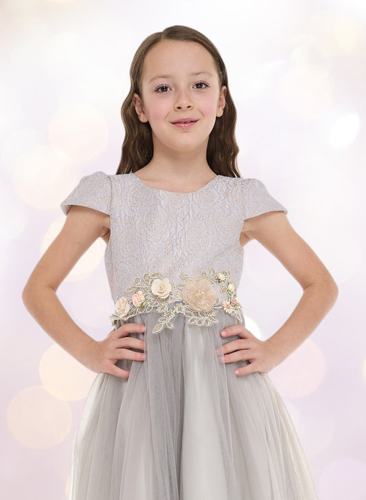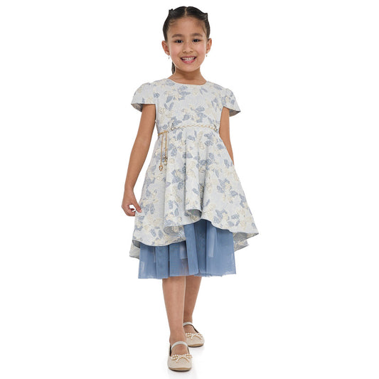 Girls Elegant Lt Blue/Gold Jacquard & Tulle Party Dress