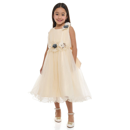 Girls Champange High Low Tail Dress With 3D Applique