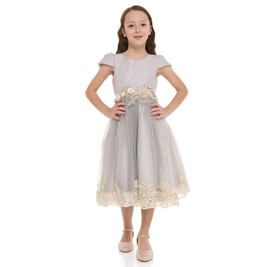 Grey/Gold Jacquard And Tulle Dress With Lace