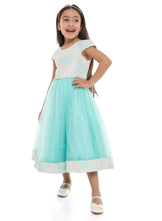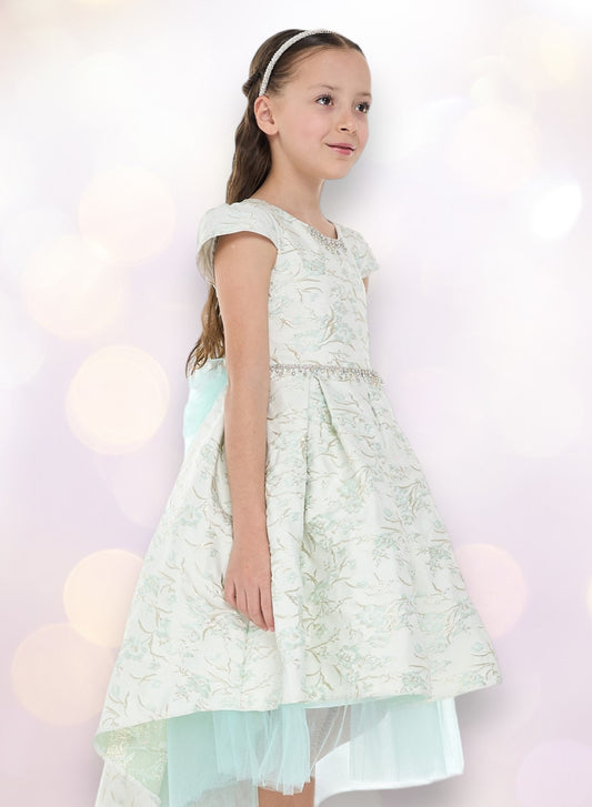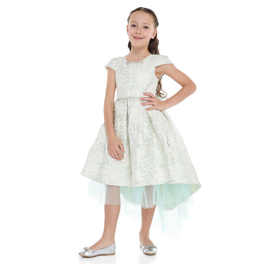 Girls Elegant Green/Gold Jacquard & Tulle Party Dress