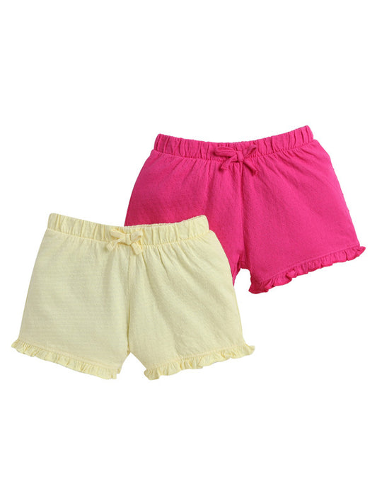 Victor and Jane Girls' Jacquard Shorts with Elasticated Waistband and Ruffle Trim- Fuschia and Yellow-Pack of 2