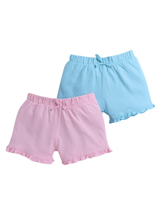 Victor and Jane Girls' Jacquard Shorts with Elasticated Waistband and Ruffle Trim- Pink and Blue-Pack of 2