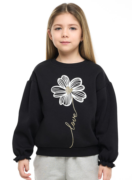 Girls Love Flower Fleece Tracksuit – Black & Grey 2-Piece Set