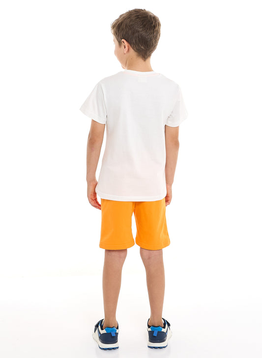 Victor and Jane Cotton Round Neck T-Shirt & Shorts Set – Detailed Print - Off White and Rust