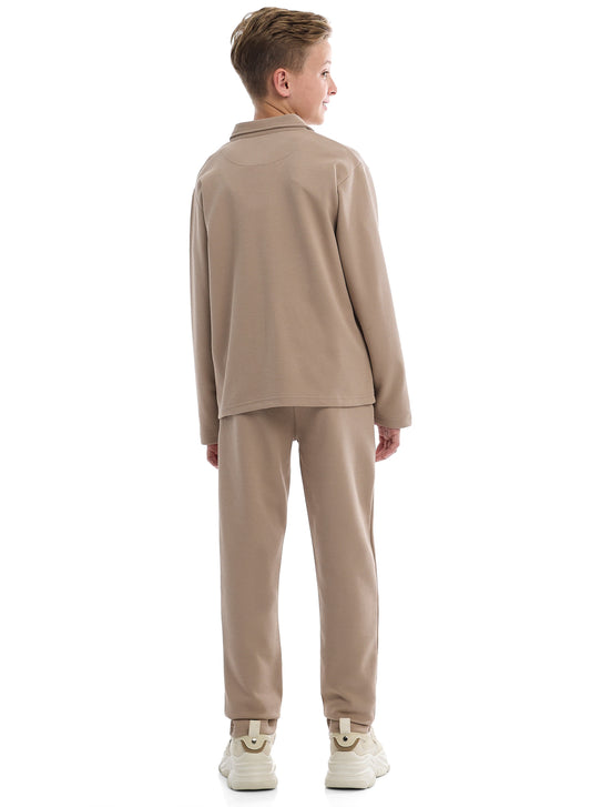 Boys Beige Twill Shirt-Style Co-Ord Set with Front Pockets & Zip Closure – Smart Casual Outfit