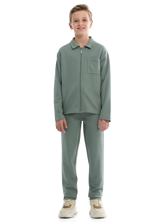 Boys Olive Green Twill Co-ord Set | Zipper Shirt & Jogger Pant | Kids Utility Style Outfit