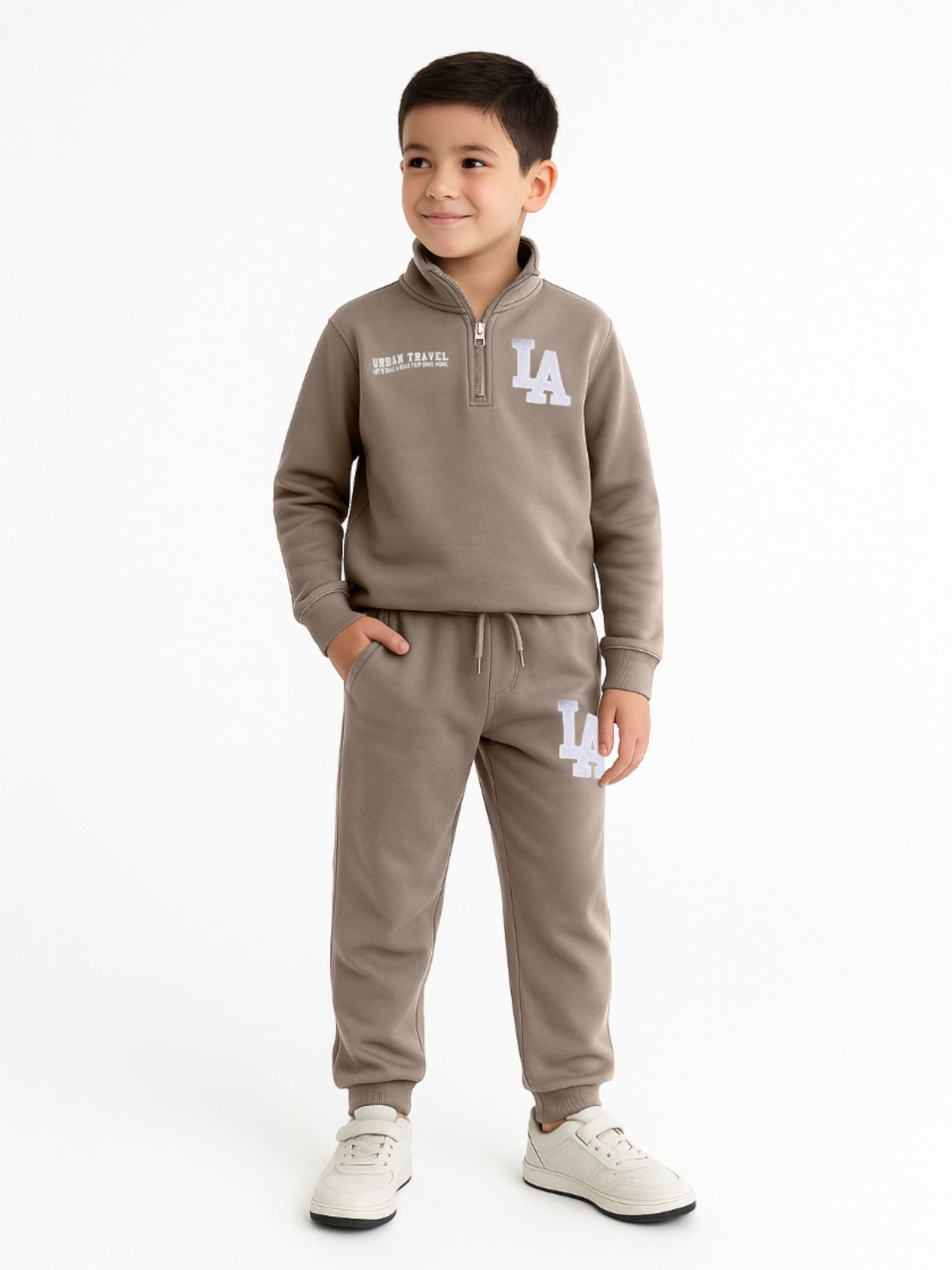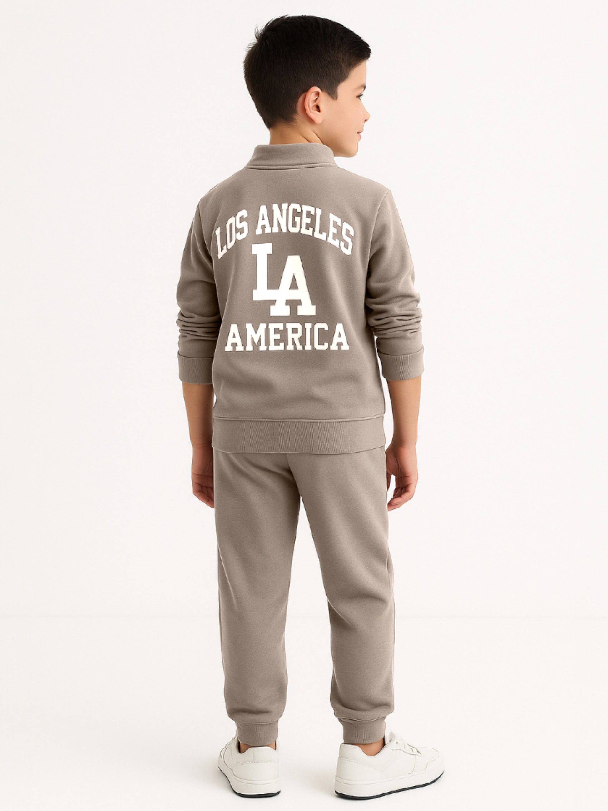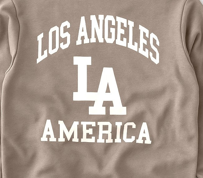 Varsity graphic prints – “LA” on chest and joggers; “LOS ANGELES AMERICA” on the back