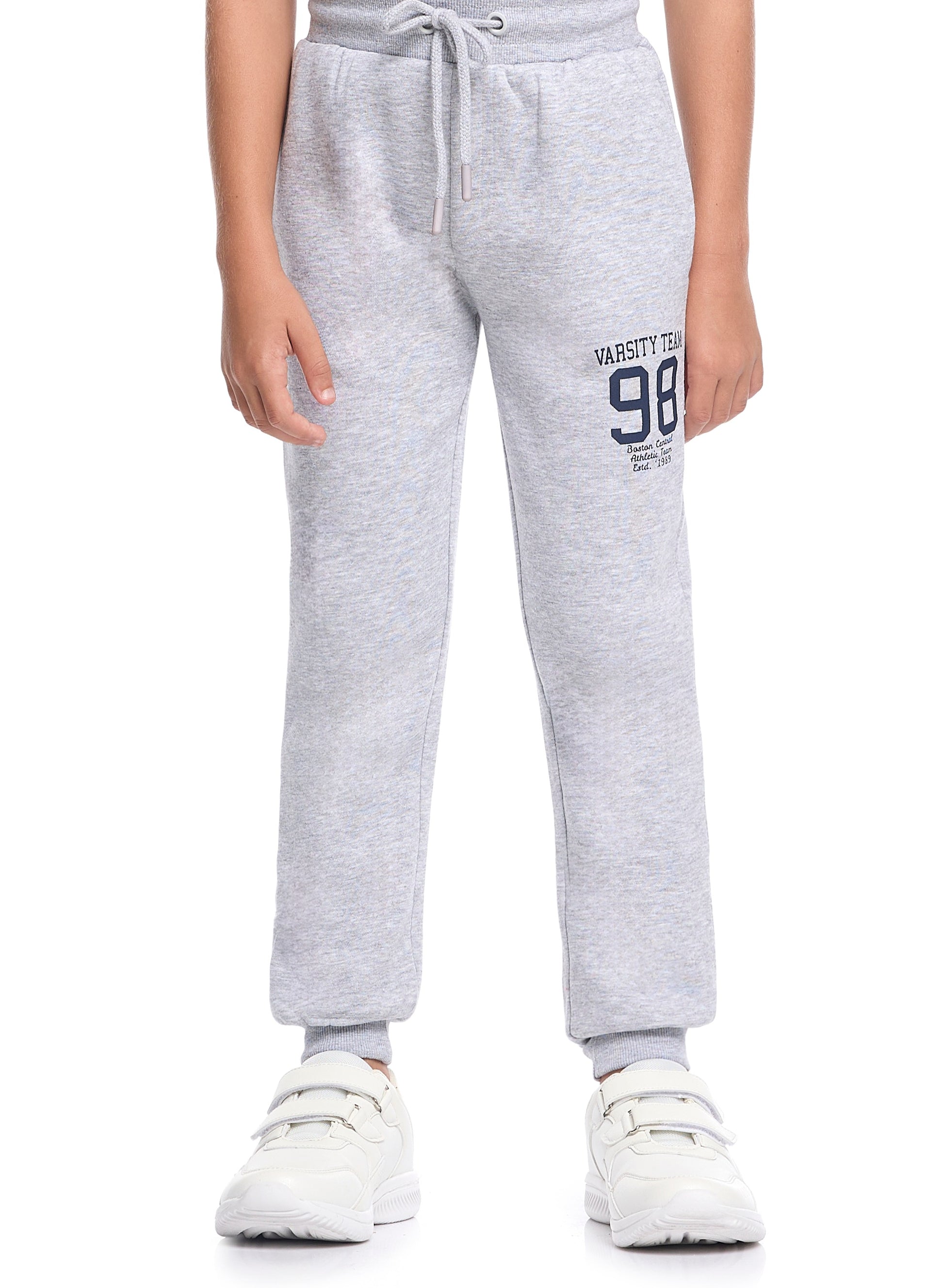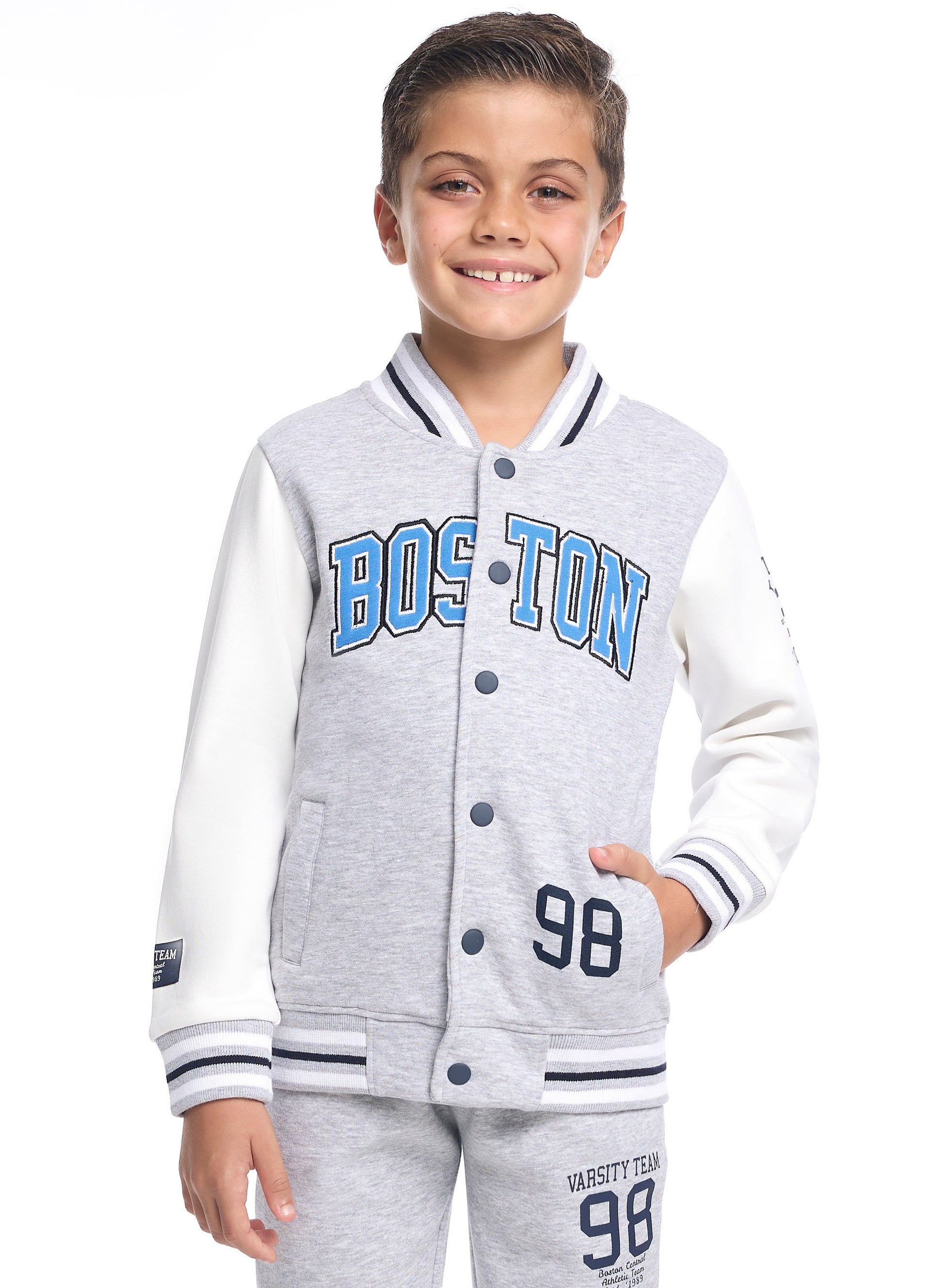 Boys’ Stylish Varsity Tracksuit – Grey Boston Print Jacket & Joggers