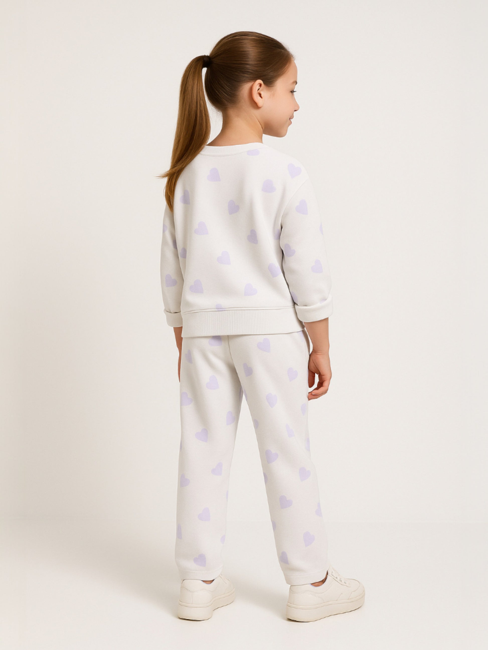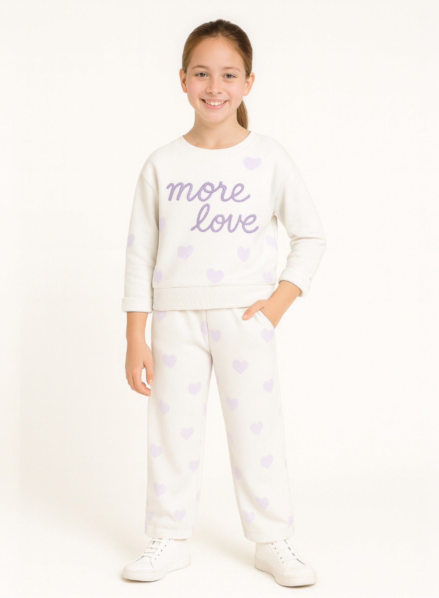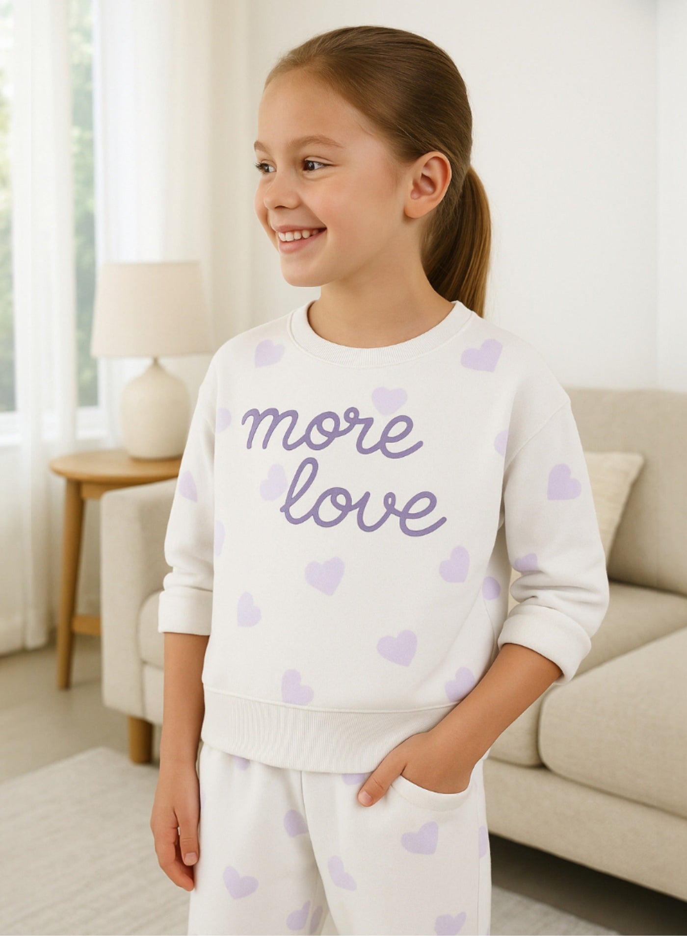Girls More Love Heart-Print Fleece Tracksuit – Cream & Lavender 2-Piece Set