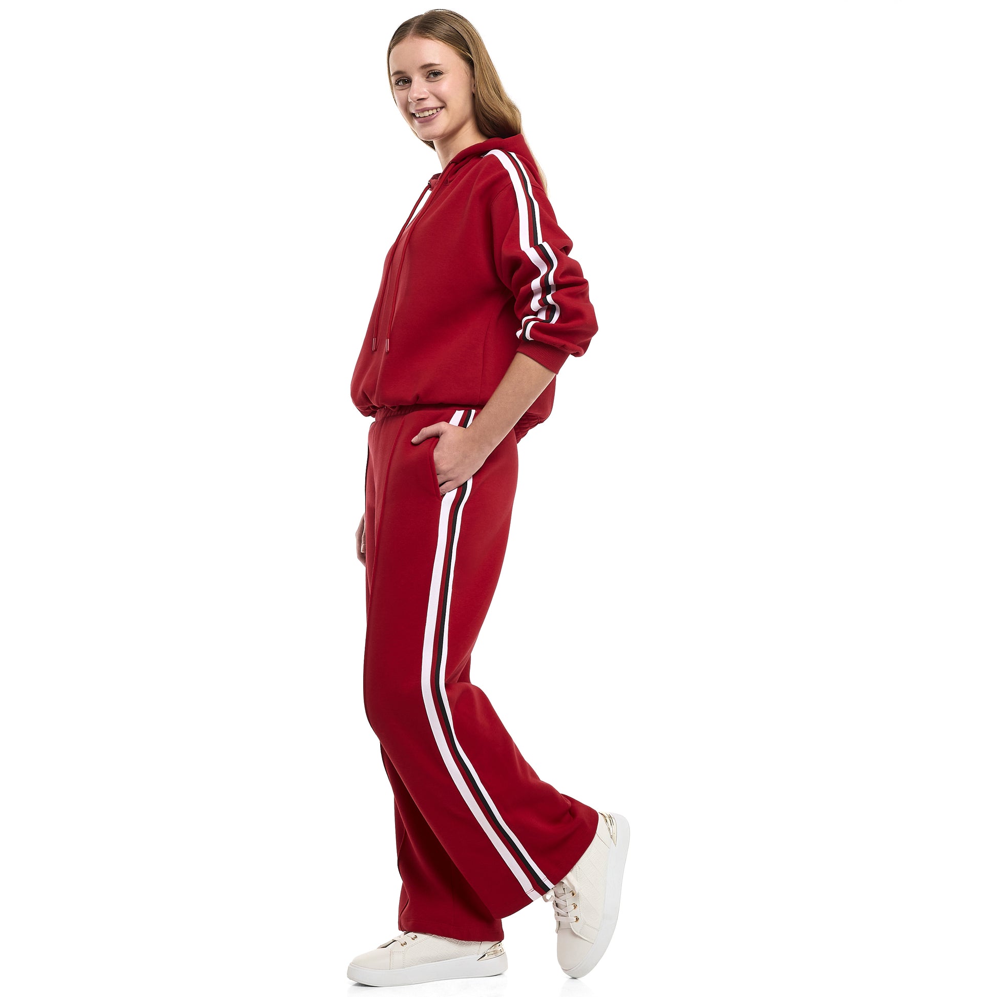 Contrast Side Stripes: Clean white piping down sleeves and pant legs