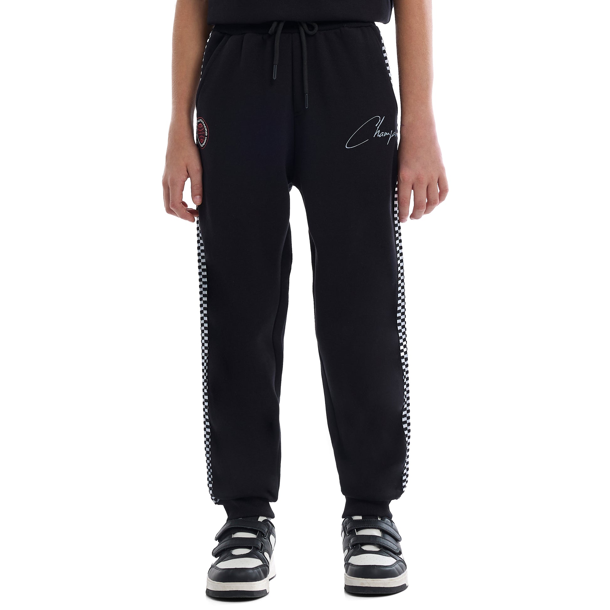 Matching black joggers with side stripe detailing and elastic waistband