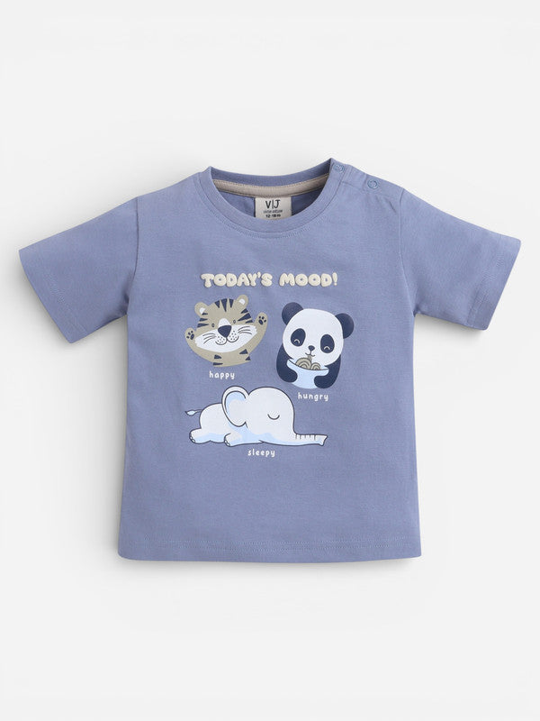 Add playful charm to your baby’s everyday wardrobe with this adorable printed T-shirt and shorts set. The soft blue T-shirt features cute animal characters with a fun “Today’s Mood” print, while the matching beige shorts offer a comfortable, relaxed fit. Designed for easy movement and all-day comfort, this set is perfect for playtime, outings, or lounging at home