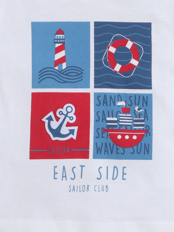 Bring playful summer style to your little one’s wardrobe with this charming nautical-inspired T-shirt and shorts set. The off-white T-shirt features a colourful sea-themed print with classic nautical icons, while the matching red shorts add a bold pop of colour. Designed for comfort and easy movement, this set is perfect for everyday wear, outings, and warm-weather playtime.