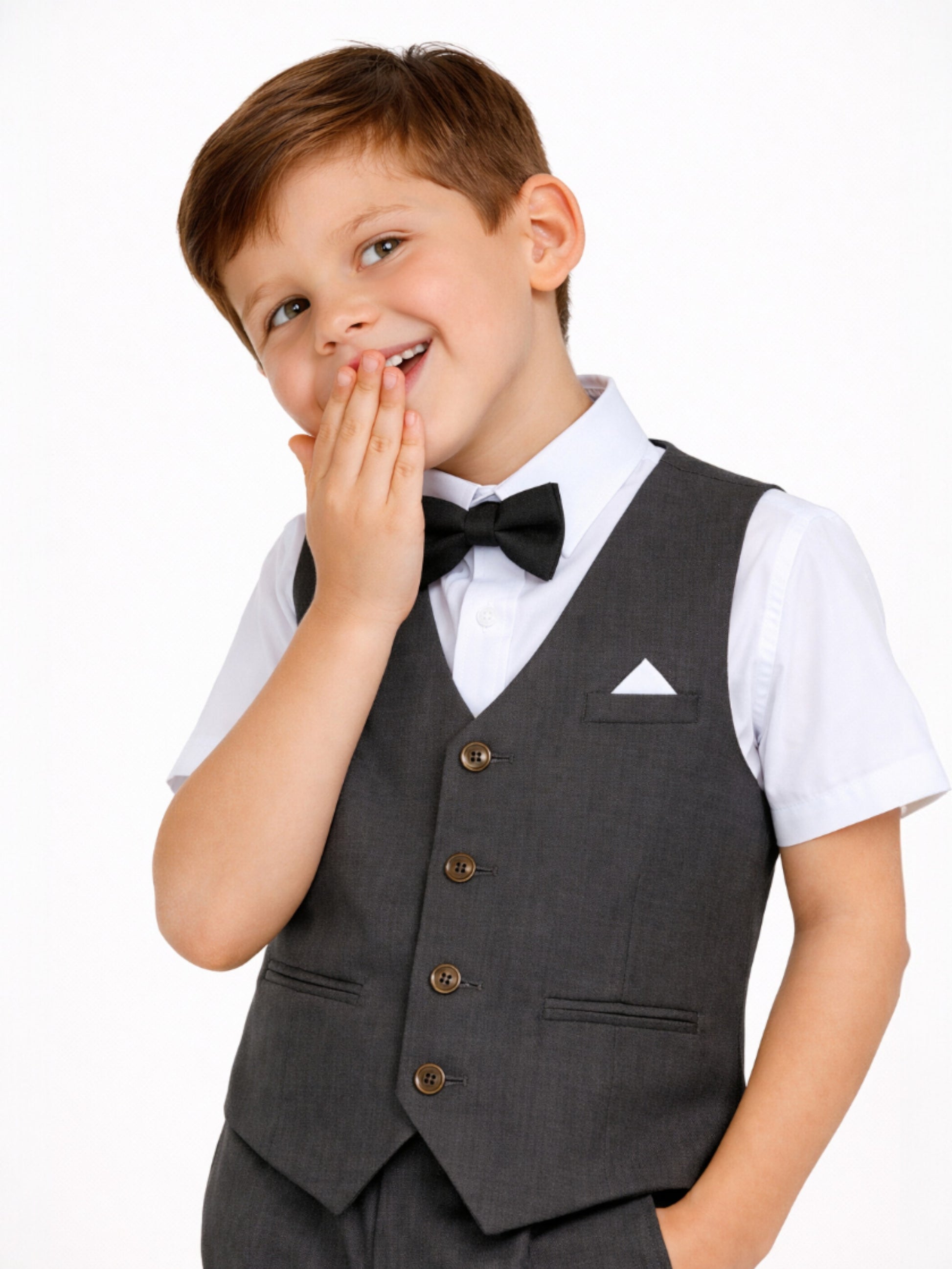 Dress him up in effortless, occasion-ready style with this refined Dark greyl 4-piece formal set. Designed to look sharp while staying comfortable, it pairs a crisp white shirt with a tailored beige waistcoat and matching trousers, finished with a classic black tie for a complete premium look. Perfect for weddings, birthdays, parties, festive events, and family functions.