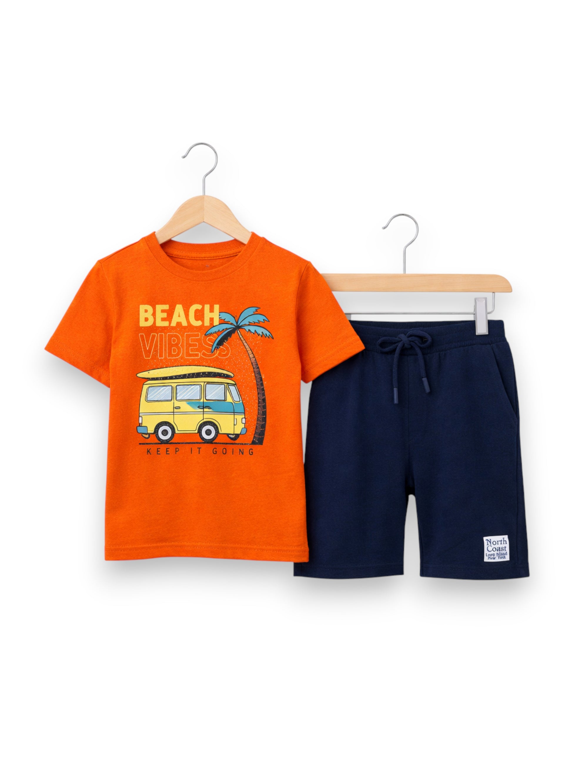 Sunny-day style made easy! This boys 2-piece set features a bright coral t-shirt with a fun beach-trip graphic, complete with a van and palm vibe for a holiday-ready look. Paired with comfortable blue shorts with an elasticated waistband and drawstring, it’s the perfect outfit for playtime, outings, and summer adventures—lightweight, breathable, and super comfy.