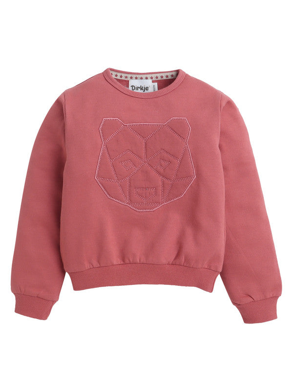 Playful Bear Graphic: Geometric bear-face embroidery on the coral crewneck sweatshirt for a modern, eye-catching accent