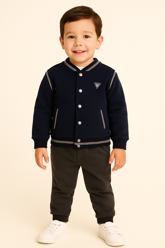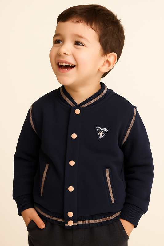 Varsity-Inspired Design: Snap-front closure with rib-knit collar, cuffs & hem, plus contrast sand-stripe detailing