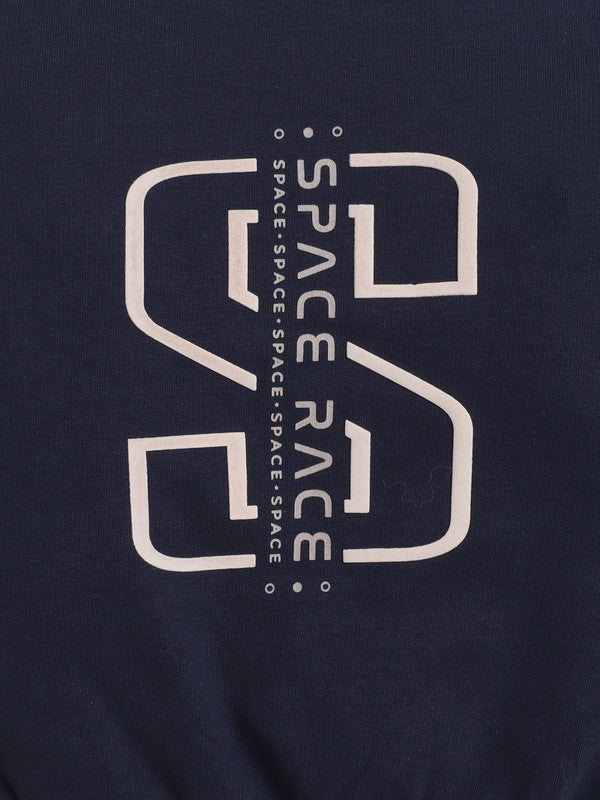 “Space Race” Graphic: Bold “S” emblem and vertical “Space Race” text printed in contrasting sand on the navy crewneck sweatshirt