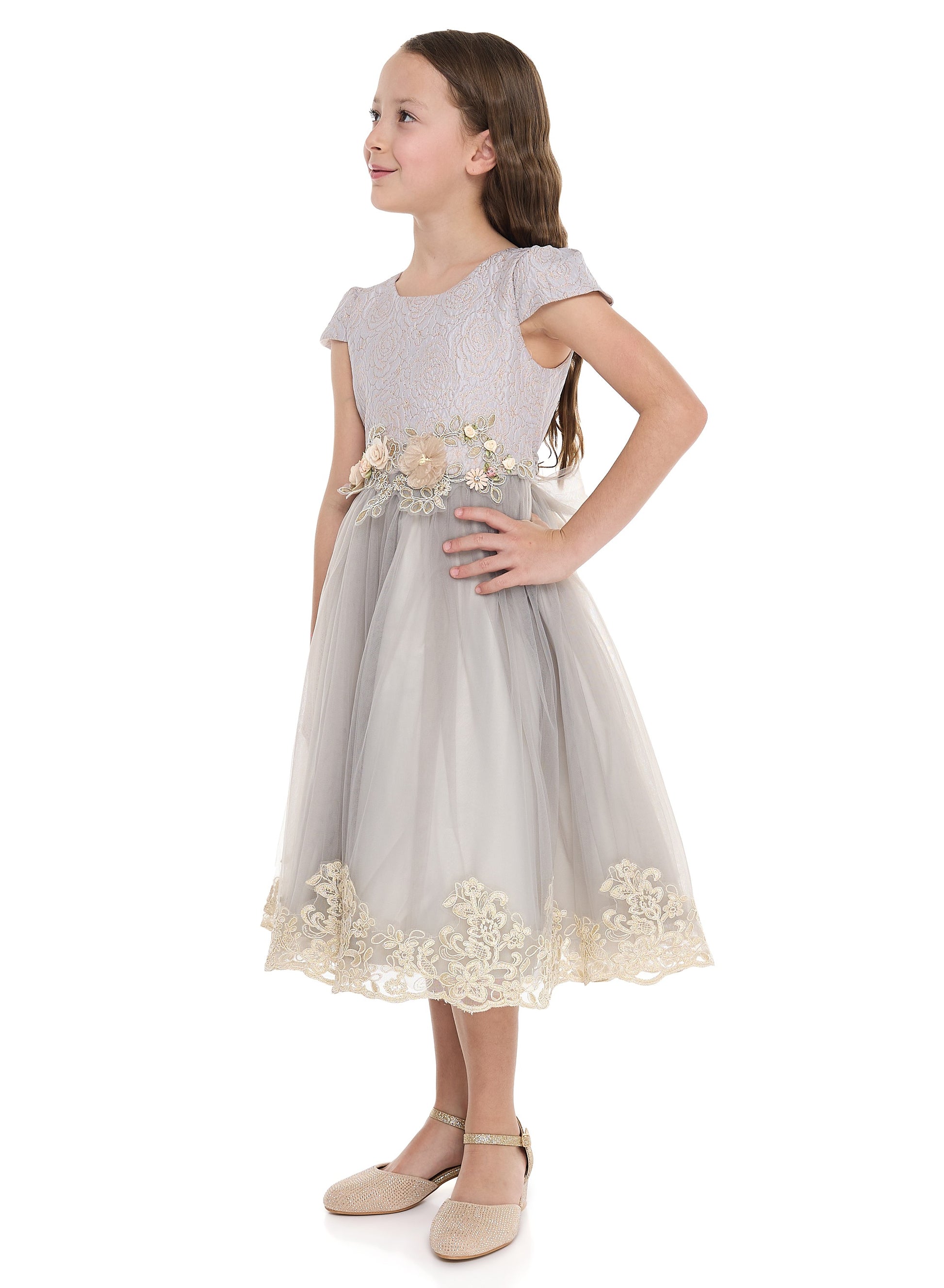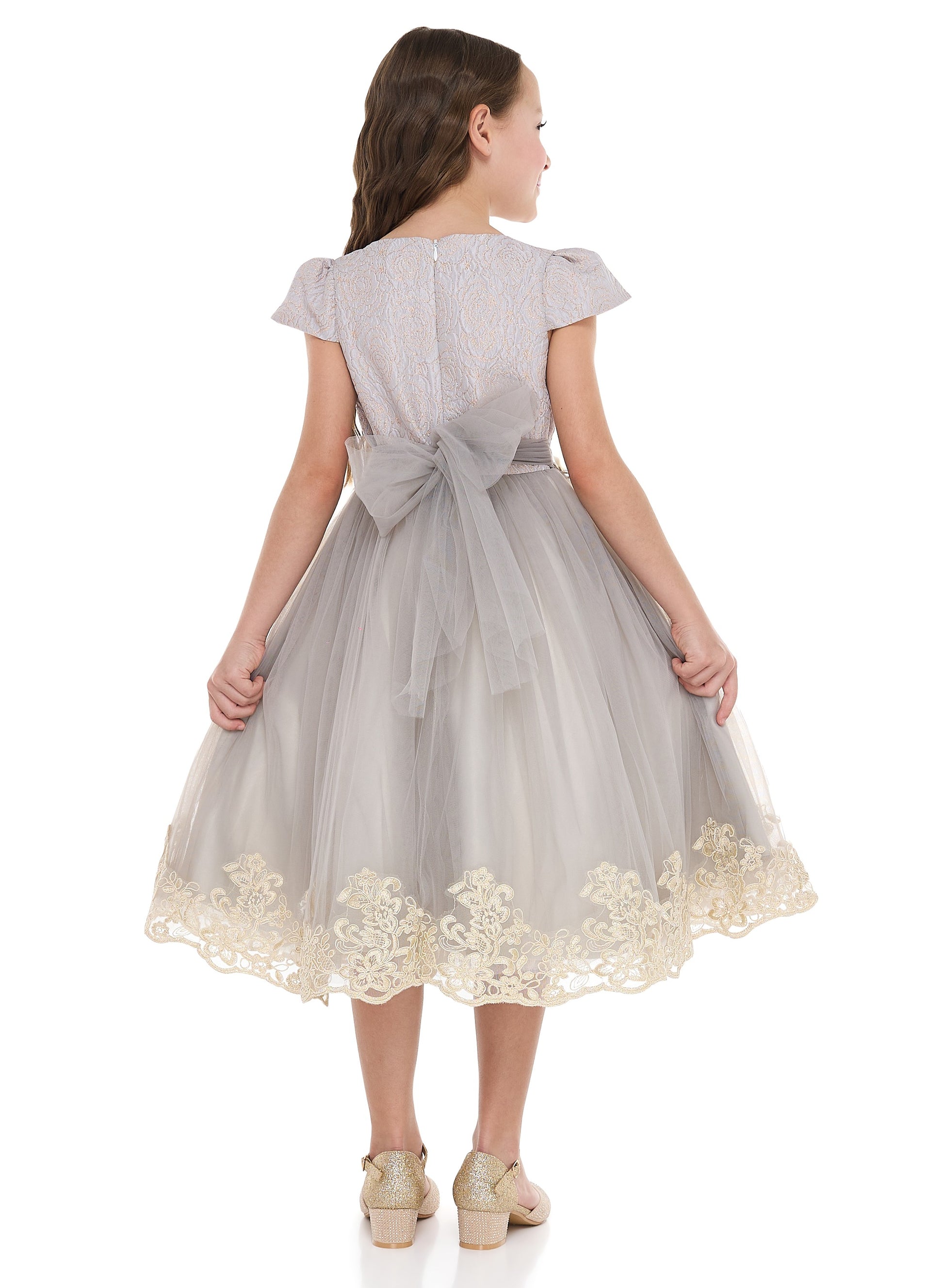Grey/Gold Jacquard And Tulle Dress With Lace