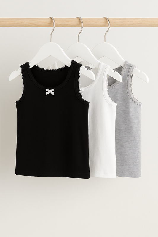 3-Pack Girls' Cotton Vests – Neutral Basics in Black, White & Grey