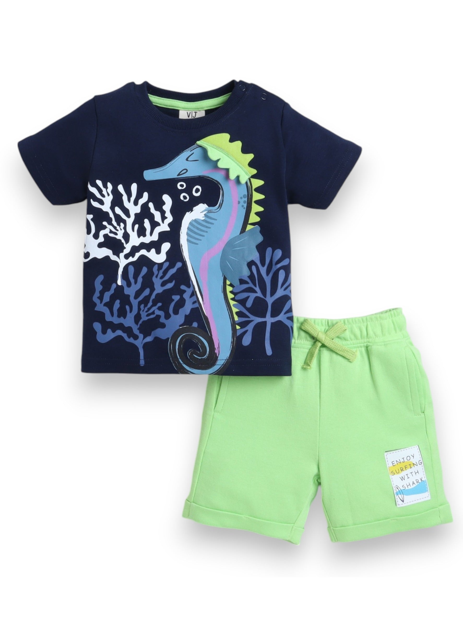 Victor and Jane Boys' Sea Horse Navy and Neon Green T-Shirt and Shorts Set