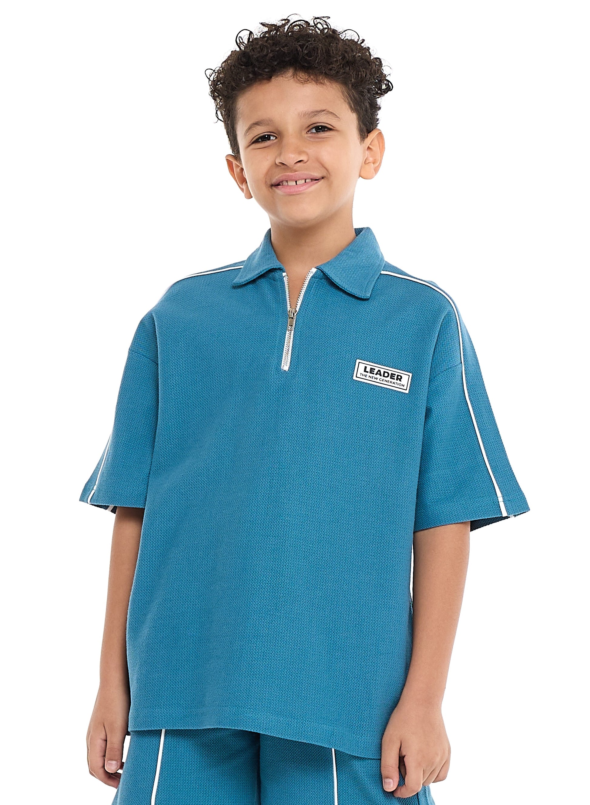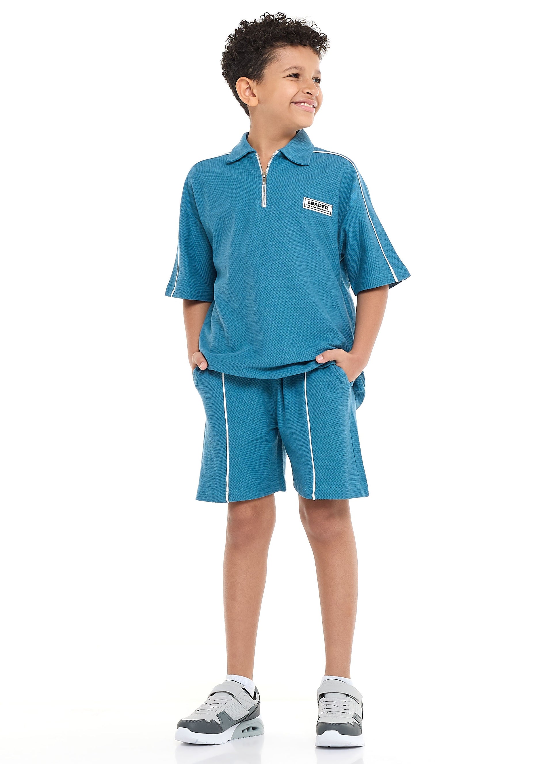 Victor and Jane Boys' Jacquard Set – Teal 2-Piece Outfit with Pockets, Polo T-Shirt With Half Zipper and Shorts