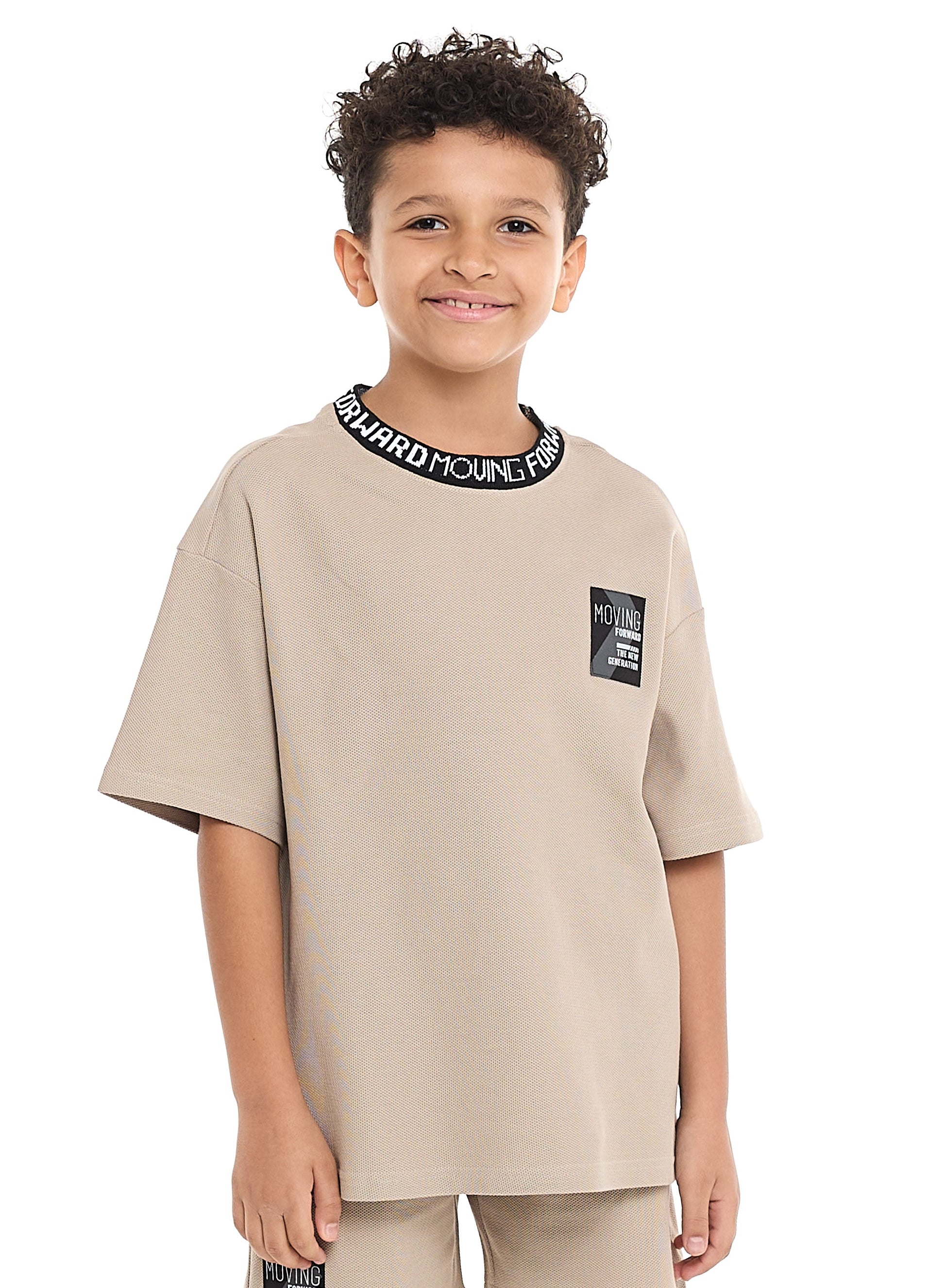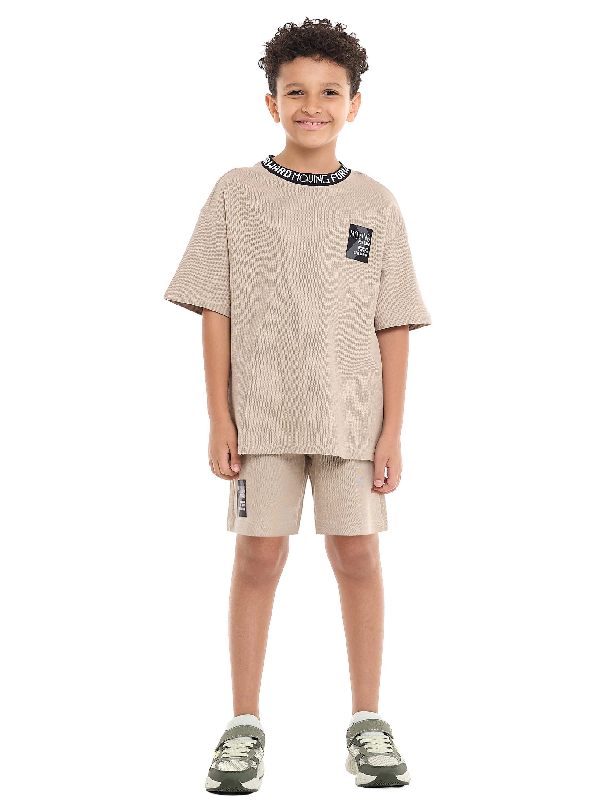 Victor and Jane Boys' Cord Set – Beige T-Shirt and Shorts Outfit with Label Detail