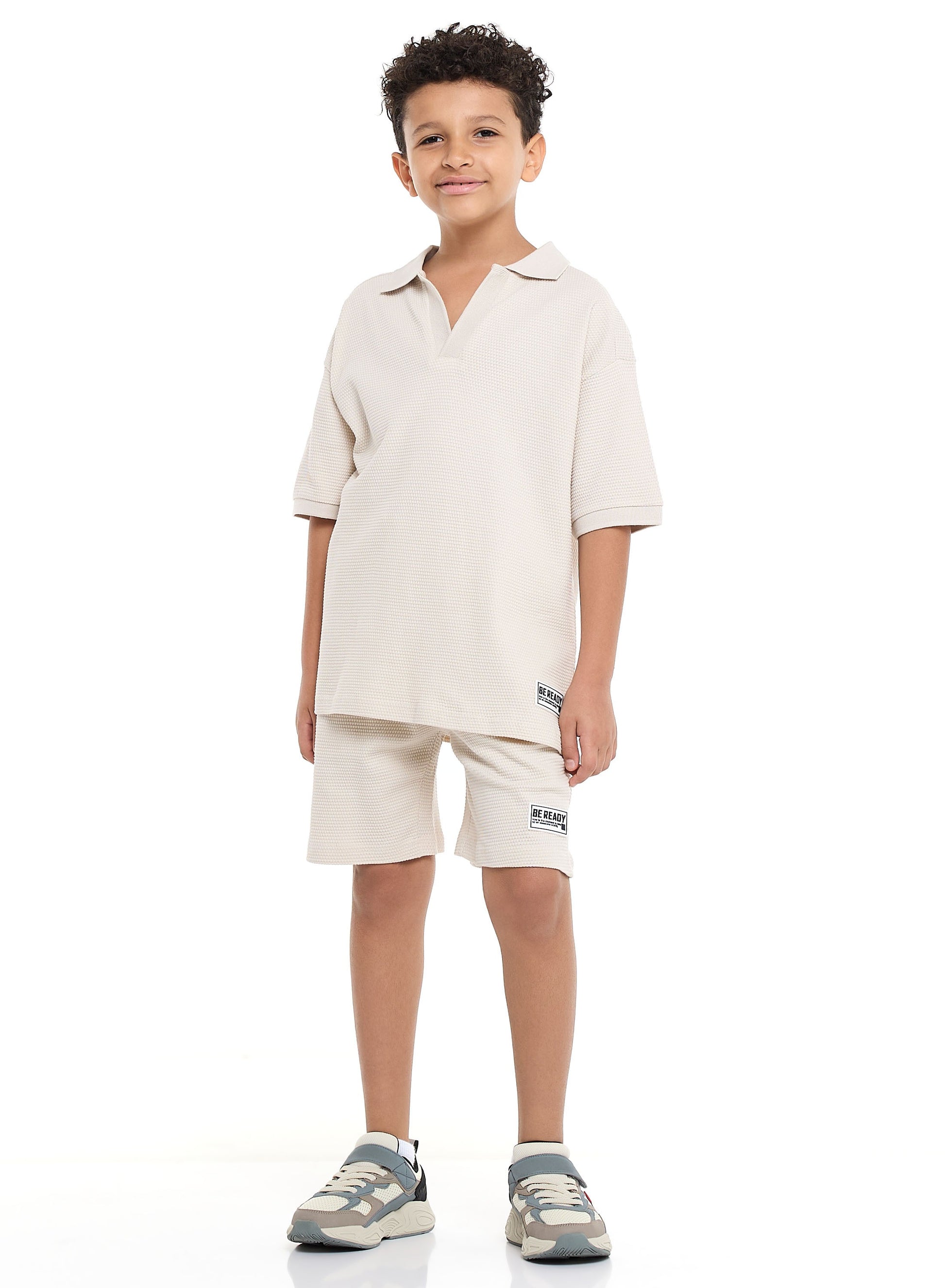 Victor and Jane Boys' Jacquard Set – Beige 2-Piece Outfit with Pockets, Polo T-Shirt and Shorts
